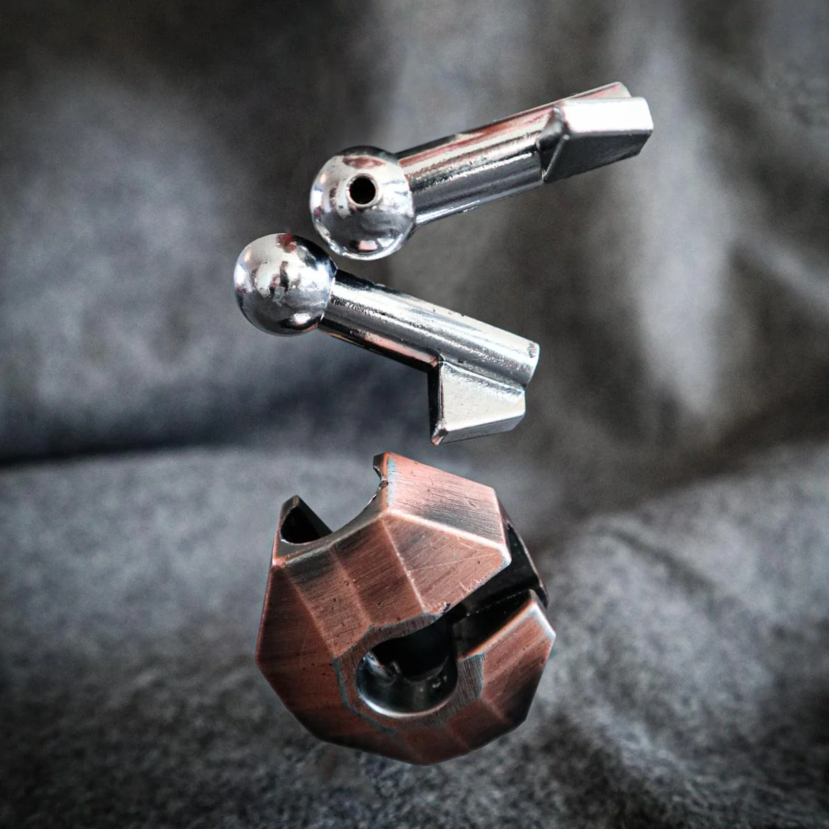 This puzzle is made from sturdy cast metal pieces and has a nice weight to it. The body has an antique bronze finish while the pins are mirrored silver. It weighs approximately 4.7oz and measures about 1 1/2" x 2 3/8" x 1 1/4" when completed.